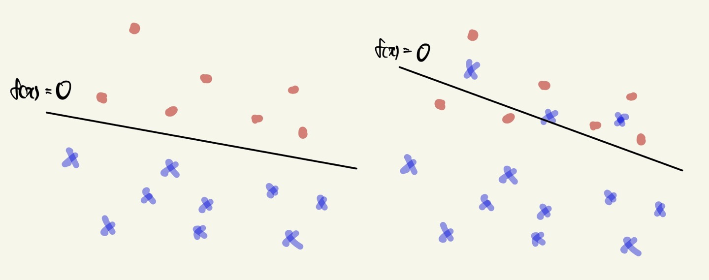 하지만 오른쪽은 어떤 선을 긋더라도 두 개의 클래스를 분류할 수 없는 경우가 존재한다.